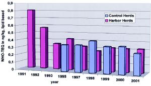 ![]() The European Union (EU) has recently established maximum limits for dioxins in animal feed and in several human foodstuffs, applicable from 1 July, 2002. For example, the maximum limit for milk and milk products is 3 picograms (pg) WHO-PCDD/PCDF-TEQ 1 /gram (g) milk fat and for fish is 4 nanograms (ng) TEQ/kg wet weight fish. Against this background, the Food Safety Authority of Ireland (FSAI) and other bodies in Ireland have examined levels of dioxins in a number of foodstuffs in recent years. Studies of dioxins in cow�s milk have been carried out by the Environmental Protection Agency (EPA) in 1995 and 2000 and by FSAI/Cork County Council (FSAI/CCC) in 2002. The EPA sampled milks in �background� areas covering the entire country and in areas of perceived potential risk, and in their 2000 survey found dioxin levels (PCDDs and PCDFs) ranging from 0.11�0.41 pg TEQ/g milk fat for background samples and 0.12�0.38 pg TEQ/g fat in samples from areas of perceived risk, with a mean of 0.24 pg TEQ/g for both types of sample. These results were approximately 16% lower than the levels found in 1995. The downward trend in dioxin levels from 1995 to 2000 has been confirmed by the FSAI/CCC study of milks taken over a 10 year period from control herds and from herds in the Cork Harbour area. Mean levels of dioxins in milk from herds in the Harbour area declined from 0.81 pg TEQ/g fat in 1991 to 0.31 in 2001 (see Figure). Levels in milk from control herds ranged from 0.28 to 0.42 pg TEQ/g fat over the period 1995 to 2001. 1 The abbreviation �WHO-PCDD/PCDF-TEQ� refers to the toxic equivalence factors (TEF) established for a range of PCDDs and PCDFs by the World Health Organization (WHO). These TEQs represent the relative toxicity of the compound being measured to the toxicity of the most toxic compound, tetrachlorodibenzo-p-dioxin (TCDD). WHO TEQs have also been established for the dioxin-like PCBs. In this article, �WHO-PCDD/PCDF-TEQ� has been further abbreviated to TEQ/g (fat) or TEQ/kg (wet weight, for fish), as appropriate. Both the 2000 EPA study and the FSAI/CCC study also analysed dioxin-like PCBs in milk, levels of which were essentially similar to those for the dioxins. The mean Irish dioxin levels of 0.2 to 0.4 pg TEQ/g fat reported for 1995�2000 can be compared with those for Belgium (2.06 pg/g), United Kingdom (1.01 pg/g), Netherlands (0.94 pg/g), France (0.67 pg/g) and Germany (0.57 pg/g) over 1995 to 1999, reported in the European Commission�s assessment of dietary intake of dioxins and related PCBs by EU Member States. Levels of dioxins in Irish cheese reported by the National Food Centre in 2000 were broadly similar to those found in milk, ranging between less than 0.1 to 0.82 pg TEQ/g fat, while levels in carcass fat from Irish beef, pork, poultry and sheep ranged between 0.04 to 2.11 pg TEQ/g, a trend towards higher values being found for sheep. The FSAI has recently carried out a study of dioxin and dioxin-like PCB levels in farmed and wild salmon and in farmed trout. The study found low levels of dioxins and dioxin-like PCBs in all three types of fish, with dioxin values in wild salmon ranging from 0.14 to 0.62 ng TEQ/kg, in farmed salmon from 0.59 to 1.50 ng TEQ/kg, and in farmed trout from 0.17 to 0.55 ng TEQ/kg. Table 1shows the mean measured values for both dioxins and dioxin-like PCBs in the three types of fish, the results indicating that the dioxin levels in Irish wild salmon and in farmed trout were on average less than 10% of the maximum limit of 4 ng TEQ/kg set in EU legislation, while the levels found in Irish farmed salmon were on average less than 25% of this limit. ![]() The results of these studies indicate that levels of dioxins in Irish food are low, compared with the values reported in many other parts of Europe for similar foods. Contact: Dr. Iona Pratt, Chief Specialist: Toxicology, Food Safety Authority of Ireland, Abbey Court, Lower Abbey Street, Dublin 1; Tel: 01-8171300; Fax: 01-8171301; E-mail: [email protected] ; Web: http://www.fsai.ie |