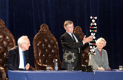 To celebrate the fiftieth anniversary of this momentous discovery, a series of events were held in Trinity College Dublin, hosted by the staff and students of the Smurfit Institute of Genetics. These events included a series of public lectures on various topics in genetics, presented in association with The Irish Times, and culminated with a visit to the College by one of the co-discoverers of the double helix, Dr James Watson, Nobel Laureate. Dr Watson's visit was generously sponsored by and organised in association with Science Foundation Ireland. ![]() The lecture was Webcast live around the world, with associated events at many universities around the country. The Webcast was sponsored by a generous grant from BioResearch Ireland, and broadcast via HEAnet. The Webcast stream can be viewed (on a PC) at: http://www.heanet.ie/projects/videoservices/videostreaming/watson%20stream/ Dr Watson gave both a personal history of the work leading up to the groundbreaking discovery and a description of its influence on the development of the field of molecular genetics. At the time that he and Crick, along with a number of other researchers including Maurice Wilkins and Rosalind Franklin, were working to discover the structure of DNA, the following facts were known: Genes had been defined as 'units of heredity' that specified various traits of an organism, passing from one generation to the next and coming together in different combinations. Genes were located on chromosomes, which were made of two types of molecule: proteins and deoxyribonucleic acid, or DNA. The 'genetic material' itself had been shown in 1944 to be composed of DNA; this theory, however, was not widely accepted. DNA seemed far too simple a molecule to fulfil this role, composed of only four types of subunit, A, C, G and T, in roughly equal amounts, with apparently very little potential to store information that could be replicated. It was utterly mysterious how this molecule could be the medium of heredity. ![]() Dr Watson also presented his views on how the diverse issues arising from potential applications of genetic research should be dealt with by society, with 'common sense' as the guiding principle. In a note that was echoed by the speakers who followed, he emphasised the crucial importance that scientific education will have in enabling individuals and society to make informed choices about the increasing number of genetic issues with which we will all be faced. Dr O'Neill gave a thoughtful response from a philosophical and ethical perspective, sounding a cautionary but optimistic note. Professor McConnell closed the session with a consideration of the impact that the discovery of the DNA double helix has had on genetic research, and an explanation of why it deserves its iconic status as, truly, 'the secret of life'. This is an edited version of an article which appeared in the 2003-4 edition of the alumni magazine, Trinity Today. Contact: Dr Kevin Mitchell, Lecturer and SFI Investigator, Department of Genetics, Trinity College, Dublin 2; Tel: +353-1-608-3067; Fax: +353-1-679-8558 |
