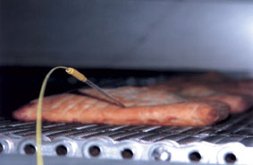 With an ever-increasing volume in the throughput of the food industry, profit margins dictate that it is no longer acceptable for large errors to occur, as the result would be a significant financial loss. This is evident in the cooking of large batches of various food types in industrial ovens with conveyor belt lengths of up to 20 metres. The conveyor belts of these ovens may be fully loaded with food for maximum efficiency and the cost of an error in one batch would be intolerable for the producer. Automation in the cooking of the food is critical in order to control oven temperature, conveyor belt speed, height of steamers, etc., so that the food is cooked to the highest quality. There is a need for monitoring the food as it passes through the oven and determining that all the processing parameters are correct, the most important of these being the food's core temperature and the colour (both internal and external).