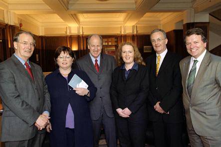 At the launch of SFI's Vision statement (l-r) Dr. Patrick Fottrell, Chairperson, SFI; the T�naiste and Minister for Enterprise, Trade and Employment, Ms. Mary Harney T.D.; Dr. William C. Harris, Director General, SFI; Prof. Dolores Cahill, Director of the National Centre for Human Proteomics-RCSI (recipient of a CSET award.); Prof. Ger Hurley, Dean of Research, NUI Galway (representing the Digital Enterprise Research Institute-NUI Galway, recipient of a CSET award); Prof. Fergus Shanahan Director of the Alimentary Pharmabiotic Centre-UCC (recipient of a CSET award.).
