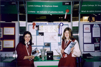 ![]() Lichens have no roots - therefore they rely on moisture from the air and the nutrients contained within it. They absorb this moisture directly and, as they have no filtering system, they must also absorb any pollutants contained in the water. SO 2 is the main cause of lichen death. It is present in the atmosphere in industrial towns and cities. The SO 2 reacts with the water in the atmosphere to form a weak sulphuric acid. When the lichens absorb this moisture, it kills them. In 1988, a survey was conducted by An Foras Forbartha and Dr �anna Ni Lamhna. The purpose of this survey was to study the lichen population of Dublin and compare the findings with SO 2 levels. We read this survey and noted that lichens were more prevalent in areas with lower SO 2 levels. Taking into account the fact that the burning of smoky coal had been banned in 1990, which we thought must have affected lichen growth, we decided to update the survey on a smaller scale. The original survey took a map of Dublin and divided it into over 300 squares to study. We chose 30 of those squares (approximately 10%) to revisit. We used the same methods employed in the Foras Forbartha report - we chose 10 random trees in each square and identified the lichens on the tree using a chart and a magnifying glass. Our results were surprising. Considering the fact that SO 2 levels have fallen all over Dublin since 1990, lichen recovery would have been expected in all areas. However, they had only recovered in 17 of the 30 squares. In 9 squares they remained the same and 4 squares recorded a disimprovement. Our theory is that lichens are affected by the massive increase in car use in the greater Dublin area over the past decade. The petrochemicals in car exhaust fumes (even unleaded) have an effect on lichens. Until we stop taking the car, our lichens cannot be restored. Alexa Byrne & Jennifer Higgins won first prize in the Intermediate Group Section in the Biological & Ecological Sciences Category at the EsatBT Young Scientist & Technology Exhibition in January 2003. They also won a Special Award presented by the Environmental Protection Agency. Their teacher was Ms Sheila Porter.