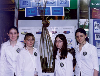![]() We fulfilled our aims and objectives but discovered much more in the course of the study. From learning the skill of basket making, we discovered it is not a simple task. There are many different techniques and various weaves involved. Different sized rods are used to make different parts of one basket. Though rewarding and relaxing, it can be tough on your hands. We did a display of our baskets at the RDS and one of the group was continuously weaving baskets as part of our exhibition. Ireland has a perfect climate for growing willows. They enjoy wet conditions, bogs and marshes. Willows have been grown in other countries as a biomass fuel. Why not in Ireland? In Northern Ireland, experiments have been carried out on this use of the willow. It could also be a means of disposing of our waste sludge and in the treatment of water. The willows are grown to be harvested regularly and burnt in a stove to generate heat and electricity. We are living at a time when our main sources of energy, fossil fuels, are declining rapidly. Fossil fuels also contribute to pollution and acid rain. Humans must find alternatives to fossil fuels on this earth if we are to maintain it for our children. Growing willow will produce a lot of oxygen. In photosynthesis, they use carbon dioxide gas. While they are growing, they can be fertilised with our waste water, as a source of nutrients. This would help us get rid of our increasing waste liquids. The knowledge we have gained in our research all points towards using the willow to its full potential in this country. Ireland is crying out for eco-friendly solutions to increasing human-caused problems. Could our versatile little willow be a stepping stone to one of those solutions? Claire Mullen, Eithne Mullen, S�ona de Lappe & Aoife Brady entered their project in the Junior Group Section in the Biological and Ecological Sciences Category at the Esat BT Young Scientist & Technology Exhibition in January 2003. They won a Special Award presented by Comhar - The National Sustainable Development Partnership. Their teacher was Ms Olivia Staunton.