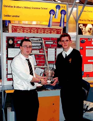 ![]() The device is constructed out of aluminium which is lightweight and portable but with a high tensile strength. The majority of the manufacturing took place in the school workshop: however we did require some specialist work to be carried out, like the welding of the aluminium, which we got done in a local engineering factory. The circuitry for the project is quite simple yet effective. It involves the use of a quad op-amp circuit in the window comparator arrangement. There are two subsections in the circuit. The first deals with the level of the ladder, and this is done by the addition of two mercury tilt switches at either end of the device. When the ladder is level, the input voltage to the op-amps falls between the allowed window of voltages and an amber LED comes on to alert the user. However if the device is tilted, a red LED comes on to tell the user what is wrong and which way to correct the level. The second part of the circuit deals with the angle of the ladder, and this is calculated by a potentiometer attached to the leg holders of the ladder and, as the angle is changed, the input voltage to the op-amps changes also. When the voltage is in the allowed window, an amber LED comes on, but if the angle is too obtuse or acute a red LED comes on to tell the user which way to adjust. A series of logic gates follows the two opamps and, when the two voltages are between the allowed windows, a green LED comes on to indicate that both level and angle are OK. We hope one day to take this idea further and mass produce the project which, in turn, will hopefully save lives. Donal Myles & Rory O Rourke entered their project in the Senior Group Section in the Technology Category at the EsatBT Young Scientist & Technology Exhibition in January 2004. Their teacher was Mr Gerald Savage. They won a special award presented by the Patents Office.