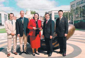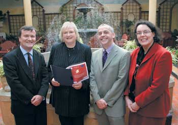 Among the award recipients under the HEA managed North South Programme for Collaborative Research (Strand I) – from left, Dr Mark Johnson (QUB); Dr Tasman Crowe (UCD); Dr Eucharia Meehan (HEA Head of Research Programmes); Mr Noel Dempsey T.D., Minister for Education and Science; Mr Paul Kelly, Department of Education and Science