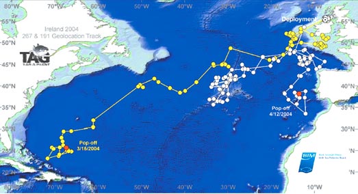 ![]() Recognising the fact that fishing of a novel species should not be allowed to expand faster than the acquisition of information necessary to provide a basis for effective management of the resource, BIM started a tagging programme for bluefin tuna in 2003. Carried out in collaboration with the 'Tag a Giant' team from Stanford University, California, and the Irish Game Fish Association, the programme aims to provide biological information, such as migratory paths, depth preferences and behaviour of bluefin tuna in Irish waters. This information will contribute to the knowledge and international management of this highly migratory species. A broader benefit of the programme is the creation of a culture of capture and release amongst Irish charter skippers and anglers, which will assist in conservation of this magnificent species. The tags used are called 'pop-up archival transmitting' (PAT) tags, which are designed to track the large scale movements and behaviour of pelagic fish and other animals. Summaries of depth, temperature and light-level data are archived in the tag, while being towed by the animal. Neither the fish nor the tag needs to be retrieved in order to obtain these data. At a user-specified date and time, the PAT tag actively corrodes a pin to which a tether is attached, thus releasing the tag from the animal. It then floats to the surface and transmits the summarised information via the Argos satellite system. Daily longitude of the migration track is calculated onboard the PAT tag using geo-location by light level techniques. Daily latitude can be calculated from transmitted light level curves using software provided by the tag manufacturer. The results provide the migration path and depth and temperature preferences of the study animal, as well as oceanographic data in the form of depth-temperature profiles. Stanford University has reported a 90% data retrieval rate for bluefin tuna tagged with PAT tags, indicating a very high survival rate for captured and released bluefin tuna. ![]() The data from the pop-ups which have occurred to date suggest that Ireland may be a feeding location for fish of eastern and western Atlantic origin. The tagging work continued in 2004. Contact: Ronan Cosgrove, BIM, New Docks, Galway City, Co. Galway; E-mail: [email protected] |