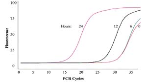Figure 2. The increase in phage DNA during infection of mycobacteria is shown above by real-time PCR. Each curve represents a different time point during infection. The PCR curves from the initial time points (0 and 6 hours) appear late, indicating low levels of DNA. As time increases, the curves appear earlier due to a substantial increase in phage DNA as a consequence of viral infection.