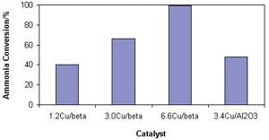 Ammonia is a well-known gaseous pollutant that has several undesirable effects on the atmosphere. For example, ammonia emissions play a part in the acidification of the environment, and its precursors are responsible for the greenhouse effect and city smog. Some methods are available for controlling ammonia emissions � such as adsorption, biological purification and catalytic decomposition. Each has its disadvantages: for example, in catalytic decomposition, ammonia decomposes in the absence of oxygen into nitrogen and hydrogen using a platinum�ceramic membrane catalyst. However, temperatures of over 600 0 C are required for this process. An alternative method for ammonia destruction, which is being developed in the University of Limerick, is the catalytic oxidation of ammonia to nitrogen and water, which operates at lower temperatures (200�400 0 C). ![]() The figure presents the ammonia conversion at 300 0 C for copper exchanged beta zeolites and a copper oxide supported on alumina. Ammonia conversion increased with copper content for the copper exchanged beta catalysts. Indeed, the 6.6Cu/beta (a beta zeolite containing 6.6wt% copper) catalyst proved to be extremely active, presenting complete conversion at 300 0 C. A promising feature of all the beta catalysts was the very high selectivity to nitrogen with little or no NO and N 2 O detected. This high selectivity to nitrogen and high activity makes the copper based beta catalyst one of the most active catalysts reported to date in the literature for the oxidation of ammonia to nitrogen. The activity of the catalysts in the presence of water has also been investigated. Water vapour does not affect the selectivity to nitrogen, although it does have an adverse effect on the overall activity. However, increasing the copper content of the beta zeolite can reduce this negative effect. Contact: Teresa Curtin, Chemical and Environmental Sciences Department, University of Limerick; Tel: +353-61-202981. E-mail: [email protected] |