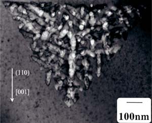 ![]() New devices based on structures known as photonic crystals can address many of these problems. Photonic crystals are periodic structures that display a photonic band gap forbidding transmission of frequencies within the band gap. This photonic band gap is a characteristic due to interaction of photons with the periodic structure, which has a different refractive index from the supporting material. In the Department of Physics and the Materials & Surface Science Institute (MSSI) at the University of Limerick, the formation of photonic crystals through the electrochemical etching of III-V semiconductors is being investigated. The mechanism that controls this process is highly dependent on the electrolyte concentration and applied voltage. Controlled modulation of the pore diameter and pore growth direction could allow the fabrication of devices based on photonic crystal structures. The figure shows a transmission electron micrograph (TEM) of a square based pyramidal porous domain produced in the early stages of electrochemical etching of indium phosphide (InP) in a potassium hydroxide (KOH) electrolyte. Domains originate from pits in the surface and pore growth occurs preferentially along mutually perpendicular directions corresponding to the <100> crystal directions, beneath a ~40 nm dense near-surface layer. The pore diameters, which can be controlled by varying the etching conditions, are also ~40 nm. The inter-pore wall thickness is limited by the depletion layer width, below which the holes necessary for growth are not available. We have generated a numerical model of the growth process and it is hoped that further research will lead to regularly repeating porous patterns that, among other applications, will allow for the fabrication of three-dimensional photonic crystals. Contact: Professor D.N. Buckley, Chair of Physics, University of Limerick; Tel: +353-61-202902; E-mail: [email protected] |