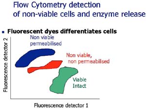 Traditionally, bacteria are deemed non-viable when cells recovered from a sample do not grow when plated onto solid agar media. However, non-viable cells impact greatly on food quality and safety either by producing flavour or generating toxins during storage. During ripening of fermented foods, Lactic acid bacteria (LAB) become non-viable. Yet their proteolytic enzymes, located inside non-viable cells, develop the characteristic flavour of foods such as Cheddar cheese. But, to be effective, these enzymes must be released into the product. Hence studying non-viable LAB will allow us to understand whether different strains remain intact, or become permeable (leaky) or autolyzed (ruptured). The balance between these different states could influence the release of enzymes, how fast a product ripens, and the type of flavour produced. In terms of food safety, pathogenic bacteria such as Bacillus cereus survive food heat treatments by forming protective spores or existing as non-viable injured cells, recovering later to grow and cause spoilage during product storage. The problem is how to identify and count bacteria in various non-viable states. Conventional staining of bacteria with fluorescent dyes, which counts a few hundred cells using a microscope, is a haphazard way to study this complex microbial ecosystem. Flow cytometry (FCM) is an exciting technique, which may solve these limitations. FCM can analyse 10 000 stained cells in 30 seconds, grouping these cells into distinct populations based on their uptake of fluorescent dyes, which label cells based on their structure and physiology. While FCM has been developed for analysis of sea-water, soil and medical specimens, it has not yet found widespread application in food analysis. ![]() Contact: Dr Martin Wilkinson, Department of Life Sciences, University of Limerick; Tel: +353-61-213440; E-mail: [email protected] |