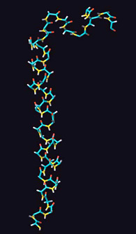 Determination of the three dimensional solution structure of polypeptides was not possible a few years back due to the lack of strong magnetic fields. Conventional analytical techniques are usually too slow and insensitive, and also require large homogeneous amounts of sample. Recent developments in the magnet technology followed by the developments in the high resolution NMR spectroscopic techniques have enabled NMR spectra to be obtained and analysed in small quantities of biologically important material. The high resolution NMR spectroscopy provides a sensitive and non-destructive analytical method for completely characterising biologically important molecules. This is also the case for the recent development of computer technology. Now we have the state-of-the-art computing facilities for interpreting solution NMR data and molecular modelling studies. By combining these two technologies, we would be able to predict the structure related parameters of biologically important molecules. Using the NMR spectroscopy we would be able to identify all the individual amino acids and their individual atomic components of the polypeptide chain. NMR data can be used to obtain the primary and secondary structural data. These structural data along with other information can then be translated into structural parameters for molecular modelling studies. Three dimensional solution structures can be obtained after several molecular modelling steps. Type 2 diabetes mellitus is characterised by a decreased responsiveness of peripheral tissues to insulin and a diminished and delayed pancreatic b-cell response to glucose. Novel therapeutic agents that normalise the b-cell response to glucose are therefore of considerable interest in the treatment of type 2 diabetes. One candidate agent is the gastrointestinal peptide, glucose-dependent insulinotropic polypeptide (GIP), which acts as major insulin-releasing hormone through the enteroinsular axis. To understand the structural requirements for the biological activity GIP, the solution structure was investigated by proton NMR and modelling. The structure of GIP is characterised by a well defined alpha-helical conformation between residues 6-29, and a second loose helical segment between residues 30-36 in 50% TFE/water. ![]() Type 2 diabetes mellitus is characterised by a decreased responsiveness of peripheral tissues to insulin and a diminished and delayed pancreatic b-cell response to glucose. Novel therapeutic agents that normalise the b-cell response to glucose are therefore of considerable interest in the treatment of type 2 diabetes. One candidate agent is the gastrointestinal peptide, glucose-dependent insulinotropic polypeptide (GIP), which acts as major insulin-releasing hormone through the enteroinsular axis. To understand the structural requirements for the biological activity GIP, the solution structure was investigated by proton NMR and modelling. The structure of GIP is characterised by a well defined alpha-helical conformation between residues 6-29, and a second loose helical segment between residues 30-36 in 50% TFE/water. Contact: Dr. Chandralal Hewage, Department of Biochemistry, Conway Institute of Biomolecular and Biomedical Research, UCD, Belfield, Dublin 4; E-mail: [email protected]; Web: http://www.ucd.ie/biochem/ch/ |