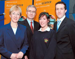 (L-R) Minister Mary Hanafin TD, Dr Hugh Brady, UCD President, Aoibheann Greenan and Kevin Murtagh, AccesScience winners.