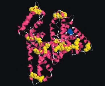 Three-dimensional structure of serum albumin showing the internal disulphide bonds (yellow) and the free sulphdryl group cys43 (blue)