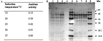 Effect of temperature on expression of AJ115 recombinant amidase. Cultures were induced for 5h at various temperatures with 1mM IPTG. (A) Amidase activity (�mol NH