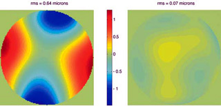 ![]() An adaptive optics system has three basic components: a wavefront sensor that measures the image distortion, a deformable mirror (or other corrective device) that compensates for the distortion, and a control system that keeps the system working in close loop. The technologies for all three components are continually changing, principally to higher performance at lower cost. Considered as an optical device, the eye has truly dreadful performance with very large aberrations, compared to those obtainable in modern optical instruments such as DVD players and cameras. It is a measure of the power of the visual processing carried out by the brain that we are able to see so well. The poor optics of the eye means that adaptive optics has a potential role, enabling the diffraction-limited optical resolution to be obtained. Several research groups around the world are applying adaptive optics in vision science. One area of application is to the improvement of instruments that are used to image the retina: the fundus camera, laser scanning ophthalmoscope and optical coherence imager. Adaptive optics improves the image quality dramatically, allowing structures hitherto invisible to be visualised. A second area of application is to enhance vision, so-called "super"-vision. In the SFI-funded Applied Optics Group at NUI Galway, we have built an adaptive optics system for enhanced vision, in collaboration with Imperial College, London. The figure below shows the excellent degree of correction obtained, from a root-mean-square wavefront error of 0.64 microns to 0.07 microns (about 1/8 of a wavelength) in this case. At present, Eugenie Dalimier, a PhD student in her second year, is planning psychophysical experiments of visual acuity in mesopic vision, that is, vision at intermediate light levels between cone and rod detection. This work is in collaboration with vision groups at City University, London and The University of Ulster at Coleraine and is also supported by the EU Research Training Network "Sharp-Eye". ![]()