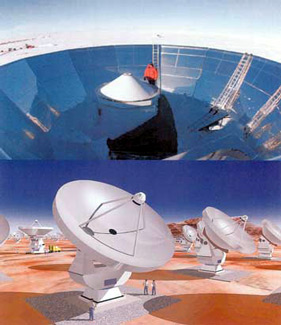 ![]() Submillimetre astronomy is often carried out from space, far above the absorbing effects of the atmosphere. However, if a dry site can be found, accesibility and the shorter timescales involved often make ground-based observing a more attractive option for novel measurements and instruments. QUaD and ALMA are two of the exciting new ground-based submillimetre telescopes with which members of the Physics Department of NUI Maynooth are heavily involved. QUaD is one of the new generation of submillimetre telescopes designed to search for the extremely faint polarisation properties of the Cosmic Microwave Background, the relic radiation left over from the Big Bang. A measurement of this polarisation will allow cosmologists to distinguish between competing models of the early Universe. QUaD was deployed to the South Pole, an excellent site for submillimetre observations, in the 2004/ 2005 summer season. It began observing in March 2005 once the sun had set (the polar winter). This year promises to be a very interesting one for Microwave Background astronomy. The Atacama Large Millimeter Array (ALMA) is a global collaboration between Europe, America and Japan to build a synthesis radio telescope that will operate at millimetre and submillimetre wavelengths. The main science goal is to better understand the origins of galaxies and stars. ALMA will study the epoch of first galaxy formation, the evolution of galaxies and the dust-obscured star-forming galaxies that optical telescopes cannot see. It will be able to study phases of star formation hidden away in dusty molecular clouds. ALMA is expected to have a major impact on virtually all areas of astronomy.