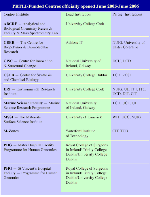 ![]() The impact of the PRTLI has been felt in twenty-seven third-level institutions, with nearly fifty research programmes, encompassing thirty-three research centres, being established. The views of those at the coal-face all over Ireland are striking. Dr Edmond Magner, Director of the Materials and Surface Science Institute at the University of Limerick, reports: "We now have a dedicated research infrastructure that can stand […] with any other facility that I have come across internationally. We have 205 researchers working in the Institute— in 1999 we had 20 academics, we now have 34; the number of post-docs has grown from 5 to 38, while we have 120 PhDs compared to 75 six years ago." Similarly, Dr John Bartlett, Director of Research at Sligo Institute of Technology, comments: "PRTLI has had a major impact on the Institute. Recently we were given the go-ahead to award our own Ph.D.s— that would not have happened without this investment." The views of Dr Florence McCarthy of the PRTLI-funded Analytical and Biological Chemistry Research Facility at UCC are no doubt echoed in many quarters. He remarks: "I'm ecstatic to be a scientist. I couldn't imagine myself being anything else because each day I jump out of bed to come to work and I know I can make a difference." Ireland is now seen as an exciting place to do research with a much improved infrastructure. This has not only given a huge boost to the morale of the institutions and the researchers involved, but it has been of major importance in assisting the institutions in attracting funding from a range of other national and international sources. In the Impact Assessment of the PRTLI published in 2004, it was estimated that an additional €250 million had been earned by the institutions. That trend has continued to date with significant funds being secured. Examples of this include UCD's Conway Institute, which has secured in excess of €9 million from agencies, such as the Health Research Board and Science Foundation Ireland, from the European Sixth-Framework Programme, and from other sources. Similarly, UCC's Analytical and Biological Chemistry Research Facility has established a strategic link with Waters/Micromass, and substantial additional investments are being made in the areas of biosciences, food and health, and nano-science. Investments from the Health Research Board, Science Foundation Ireland and the European Sixth-Framework Programme are also to be found in the RCSI and in UCD's Centre for Synthesis and Chemical Biology (CSCB). The CSCB at UCD was opened in 2006 by Taoiseach Bertie Ahern. It is a 2,300 m 2 building comprising six state-of-the-art laboratories for synthetic chemistry, and mass spectrometric and nuclear magnetic resonance (NMR) spectroscopic facilities. The UCD-led collaboration with TCD and the RCSI, which was funded by a grant of just under €26 million, is the largest single investment in chemistry research made by the Irish Government, and represents a significant platform for the creation of "fourth-level Ireland". The development of a "fourth-level sector" is seen as essential if we are to produce the knowledge leaders and the climate of innovation requisite for Ireland's future economic growth. Similarly, the Environmental Research Institute at UCC had its official opening by Mr Dick Roche TD, Minister for the Environment, Heritage and Local Government in 2006. The entire building is part of a sustainable building research project run by the Department of Civil and Environmental Engineering and it incorporates, on a large scale, "green building" initiatives such as geothermal heating, solar panels and heat exchangers. Environmental science research has been strongly supported under the PRTLI, with over €60 million in total being allocated to institutions in Ireland. A total of 320 researchers are now employed pursuing vital investigative work that will play a major role in building an improved and sustainable future for Ireland and the world generally. Funding of the order of €27 million has been provided under the PRTLI for the Environmental Research Institute. Linkages with industry are a key component of PRTLI projects, and in Athlone Institute of Technology, the Centre for Biopolymer and Biomolecular Research (CBBR) is working closely with medical device and diagnostics companies. The Centre, which was officially opened in the last year, builds on two of the Institute's main strengths—toxicology and polymer engineering—and provides space and resources to support more than twenty researchers. The interface and synergy between multidisciplinary teams is considered to be crucial for the development of new biomaterials and the biological exploitation of polymers. To facilitate these developments the CBBR is acquiring state-of-the-art equipment, including robotic work stations, real-time quantitative polymerase chain reactors (PCR), high-through-put plate readers, fast protein liquid chromatography gene expression microarray technology, and µTA (thermal analysis) and surface microscopies. An on-line guide to PRTLI-funded centres is available at www.hea.ie/PRTLI . The interactive map groups the research programmes funded by the Programme for Research in Third-Level Institutions (PRTLI) under five thematic areas: biosciences and biomedicine, environment and natural resources, physical sciences and technology, social sciences and humanities, and library. The interactive guide displays the geographical dispersion of PRTLI funding. Further information on each funded centre is available by following the link to the centre's own website. ![]() IReL - Irish Research Library Support for Irish researchers continues to improve and the expansion in 2006 of IReL—the Irish Research Library—to cover not only the fields of biotechnology and information communications technology, but also the humanities and social sciences, has been described by users as "improving the information infrastructur