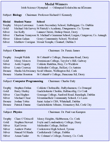 The IBM/DCU Irish Science Olympiad, an All-Ireland science competition in Biology, Chemistry, Computer Programming and Physics, is open to all second-level students from the Republic of Ireland and from Northern Ireland. All second level schools are asked to nominate their best science students to take part. In addition the Department of Education & Science through the SEC provided the names of the high achievers in both Science & Mathematics in the Junior Certification Examinations of 2003 and 2004. As a result over 500 students from every county in Ireland converged on Dublin City University on Saturday January 28th 2006 to compete in the 2006 Irish Science Olympiad. These students competed for gold, silver and bronze All-Ireland Science Olympiad medals and for places on the Irish 2006 International Biology (IBO), Chemistry (IChO), Computer Programming (IOI) and Physics (IPhO) Olympiads teams. Each student was presented with a certificate.