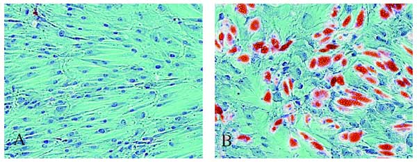 Human mesenchymal stem cells isolated from the bone marrow of a healthy volunteer grown in the laboratory (A) under conditions which keep them unspecialised ('undifferentiated') and (B) under conditions that cause them to 'differentiate' into fat cells.