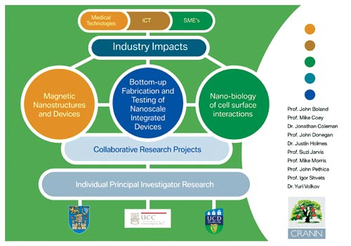 ![]() CRANN is affiliated with the Schools of Physics, Chemistry and the Life Sciences in TCD. It provides a unique collaborative and inter-disciplinary environment in which innovative research is carried out by teams of internationally renowned experts, from the Schools, and leading industry figures from our industrial partners. This research aims to address the big challenges faced by the Information and Communication Technologies and Biotechnology sectors. One of the defining features of CRANN is its mission to combine the academic excellence of research-ers at our partner universities, TCD and UCC, with the expertise and experience of our industrial partners, Intel and HP. CRANN capitalises on the research and innovation that comes from having the best people in the best environment. Research at CRANN CRANN's objective is to make a significant impact on nanoscience over the next ten years. The focus of its research is on the physics and chemistry of materials, including biomolecules. These materials are specifically structured at the nanoscale with the aim of achieving novel device functionality. The major research areas include the liquid-solid interface, laterally-structured systems and surface-grown systems, and were specifically identified because they leverage existing expertise and have the potential to produce significant innovation in science and technology. CRANN's mission encompasses three research themes: