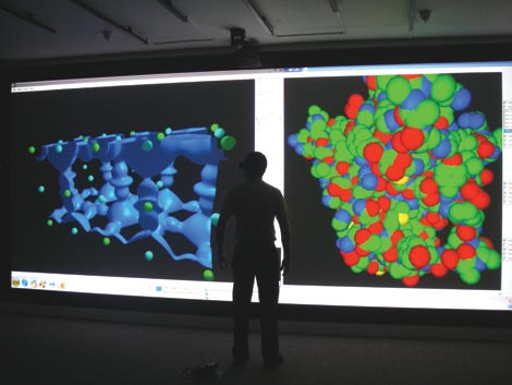 ![]() Visualization Increasingly, the most important scientific problems can only be tackled by multidisciplinary teams of researchers. New facilities and collaborative tools are vital to enable scientists to communicate with each other in an effective and transparent way. One method used by IITAC to address these challenges is the development of visualization facilities and software. The recently installed IITAC visualization facility comprises of an impressive 5.6 x 2.3m (20 foot) rear projected flat screen with stereoscopic display properties. The facility was installed by SGi and Fakespace. The image is projected by two Christie Mirage 2000 S+ projectors driven by an eight processor SGi Prism. Scientists use virtual reality technology and special shutter glasses to convert their data into 3D viewable objects which appear to float in space in front of the screen. A high-end ultrasonic tracking system is used to monitor the position of interactive devices allowing the scientist to manipulate and modify their 3D images. Computational modelling and vis-ualization techniques are used by researchers to gain greater insight into problems in their field of research � IITAC researchers in Chemistry, Biochemistry, Pharmacy and TCHPC have developed new visualization applications in solid state material analysis and in-silico drug-design. Visualization is often used as an aid to help explain complex systems to collaborators and spectators from multiple scientific backgrounds. Trinity College is at the cutting edge of graphics and visualization research. IITAC researchers in Computer Science have developed new methods for the realistic depiction of scientific phenomena, physically based animation, and complex virtual environments (such as "Virtual Dublin"). The results have been published in the highest impact graphics and visualization journals and conferences, and the School recently hosted the 26th annual conference of Eurographics, the European Association for Computer Graphics, which attracted over 460 international delegates to TCD. See http://www.tchpc.tcd.ie/systems/vis/ A visualization facility for Ireland ![]() Contact: Prof. Graeme Watson, Director, Trinity Centre for High Performance Computing, Lloyd Institute, Trinity College, Dublin 2. Ireland. Web; http://www.tchpc.tcd.ie/ |