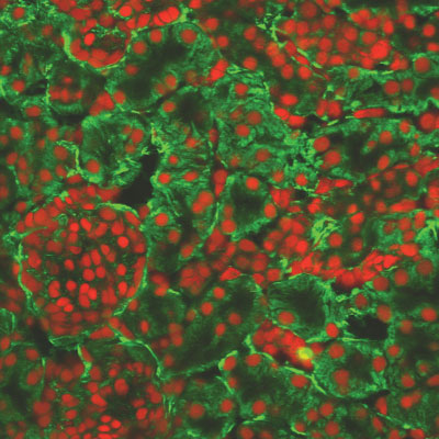 Fibronectin occurs normally in the kidney and acts like a scaffold onto which the tubules are built. In the picture below, we can see fibronectin (stained in green) arranged in rings around the kidney cells (stained in red). However, an excess of this protein can crowd and squash the tubules causing interference with their normal activities, as happens in kidney disease.